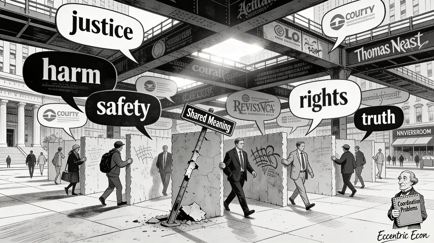 And that raises a question that is more institutional than linguistic: how do societies continue to coordinate when words themselves are contested terrain?