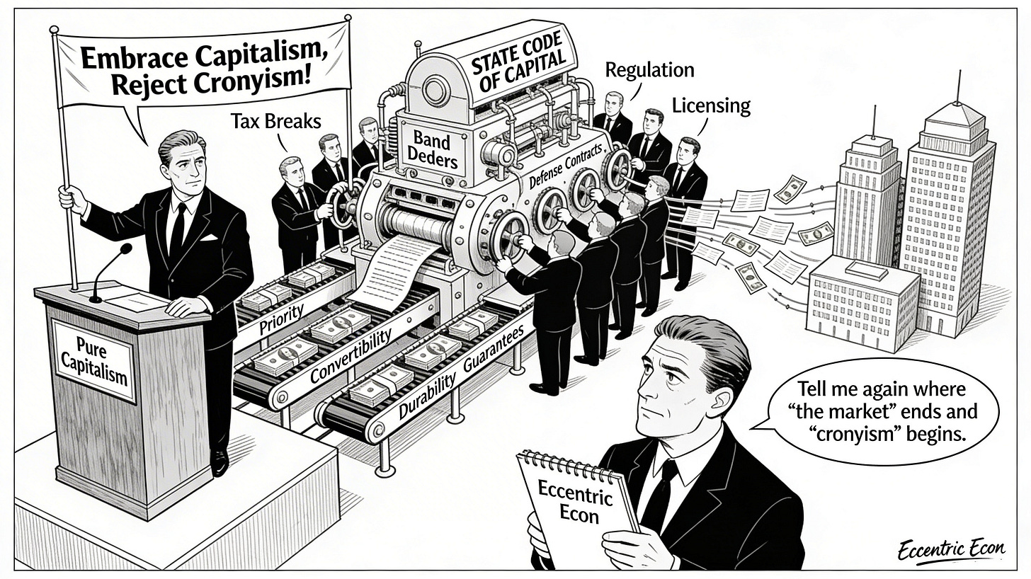 Once you accept that, the line between capitalism and cronyism stops being “markets versus government” and becomes a question about how the government’s unavoidable role is structured, and who gets to shape it.