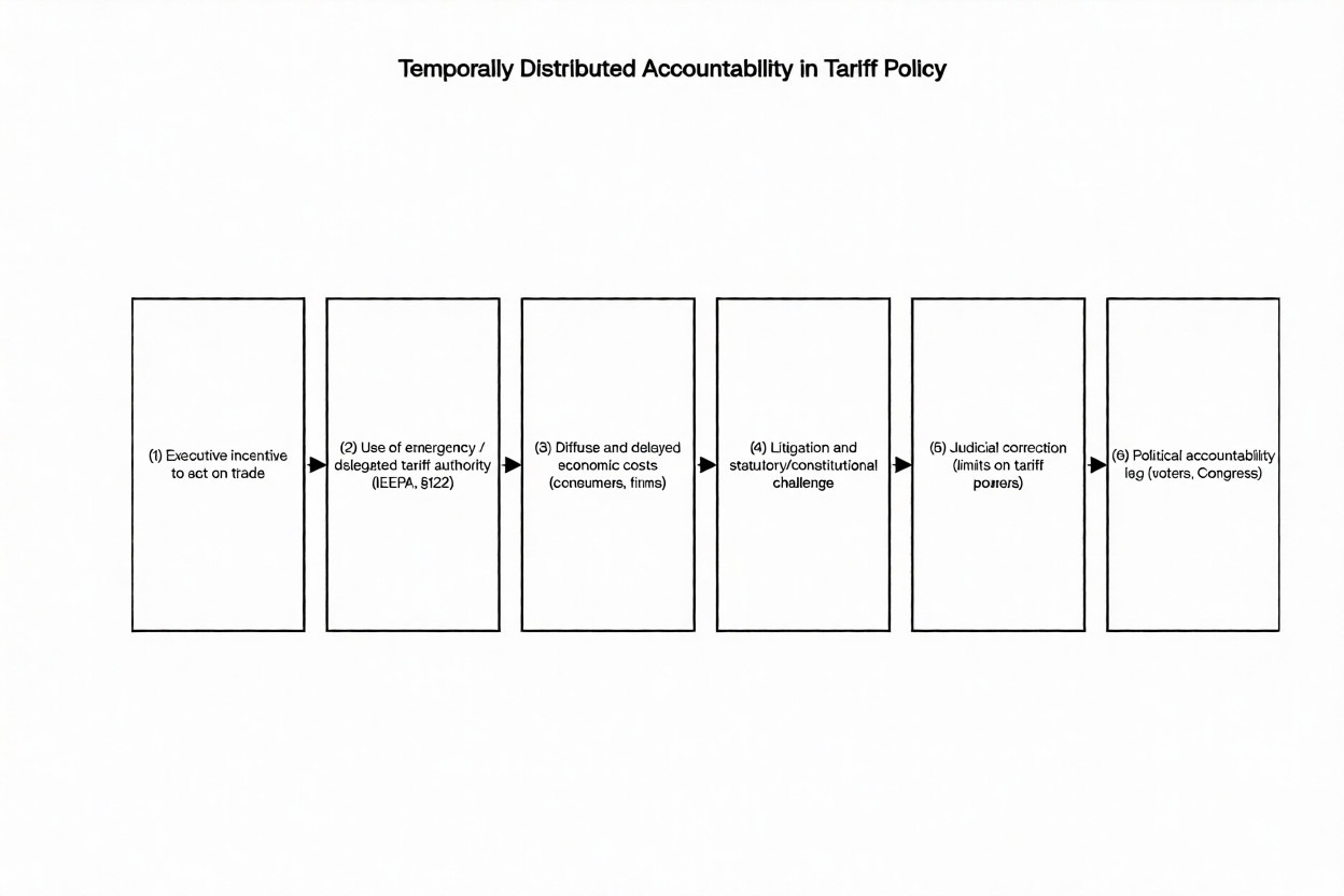 This sequence—executive incentive, emergency-channel activation, diffuse costs, delayed judicial review, and lagged political response—is what “temporally distributed accountability” looks like in a concrete legal setting. The Constitution’s allocation of tariff and taxing power to Congress remains formally intact, but the timing of when that allocation actually binds behavior is mediated by statutory design, litigation dynamics, and the political economy of diffuse versus concentrated costs.