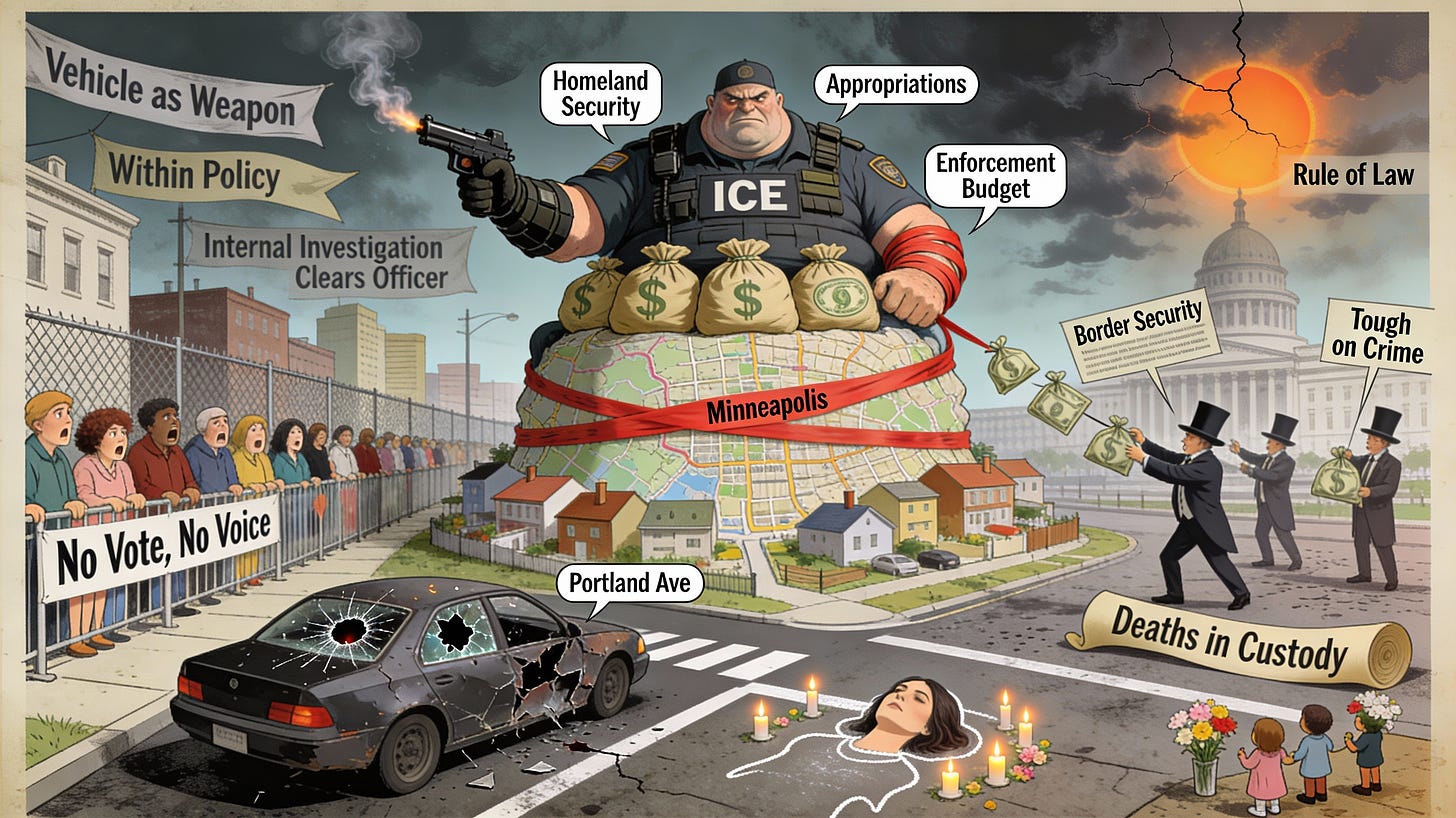 The Minneapolis killing is still under investigation. Full video has not been released. Details will matter for criminal liability and for the family’s pursuit of justice. But even if every contested fact broke in the officer’s favor—even if the car’s movements were more threatening than early reports suggest—the architecture that made this outcome likely would remain. As long as that architecture stays in place, the question is not whether another person will die under federal crosshairs in a city that did not invite them. It is when, where, and how much harder it will be, next time, to call the budget line what it has become.