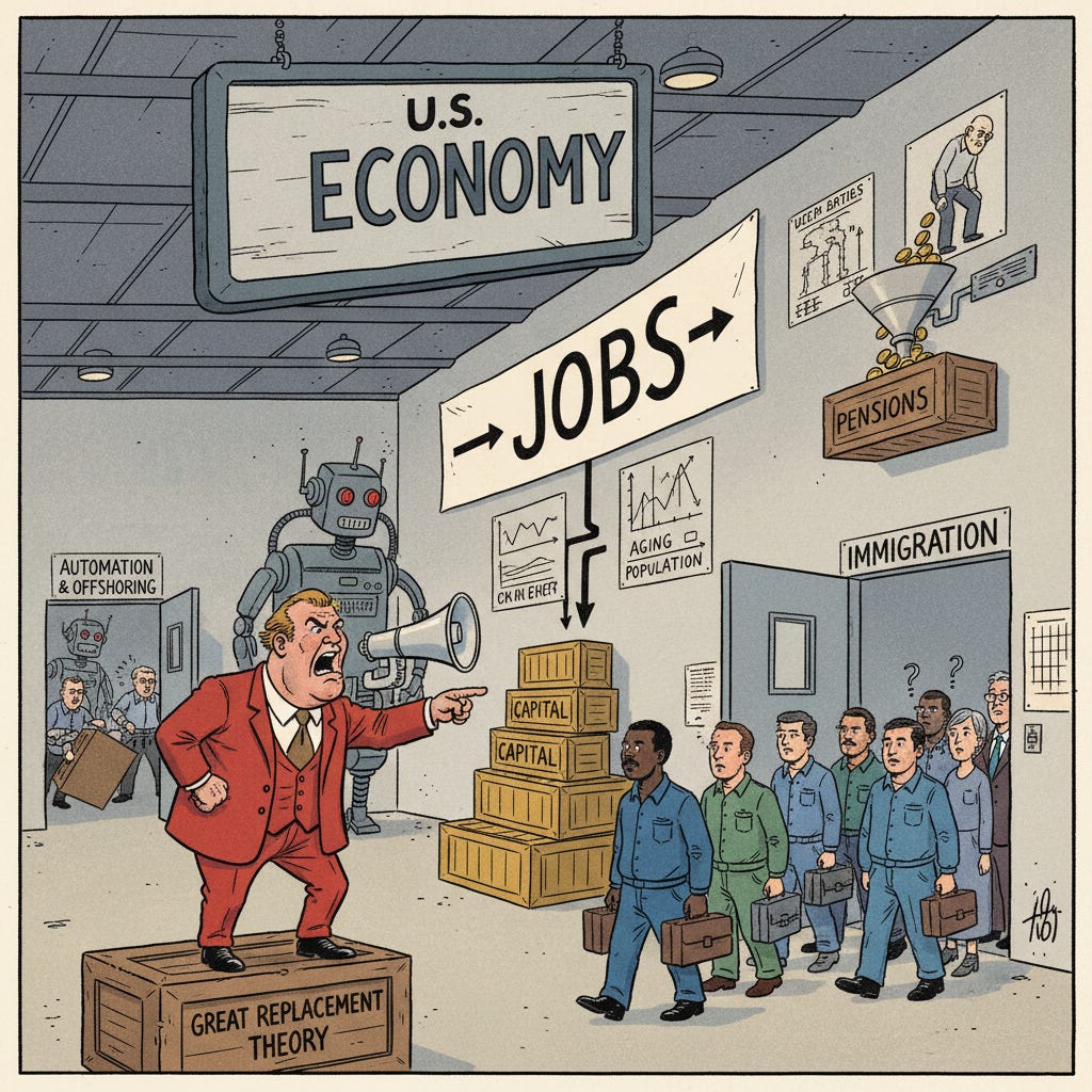 Voters are being sold a conspiracy theory where an economic argument should be. Great Replacement theory is not just poisonous politics; it is profoundly confused about how labor markets, public finance, and growth actually work. The tragedy is that it takes real dislocation and anxiety and channels them into a story that is emotionally satisfying, intellectually lazy, and economically backwards.