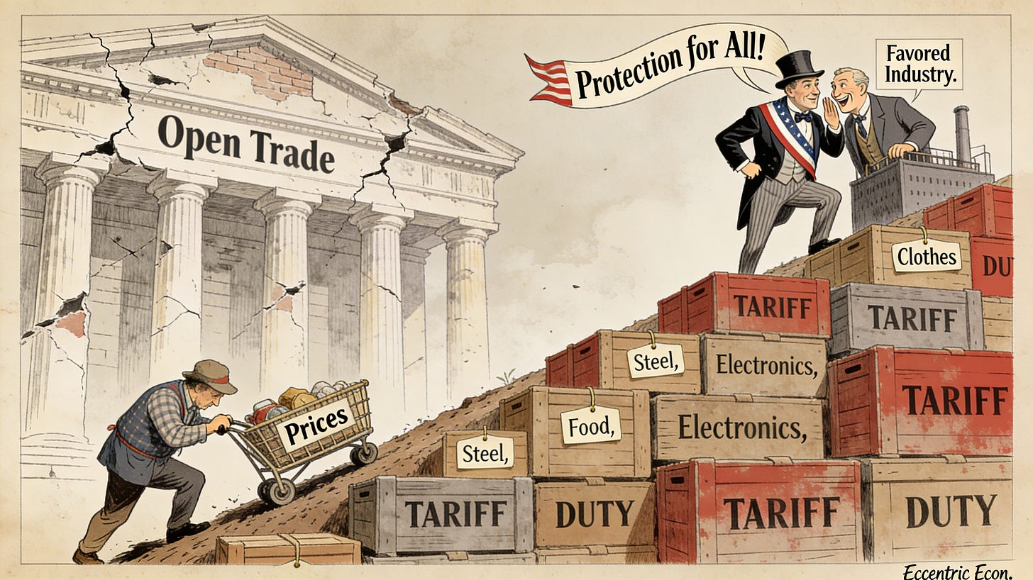 Tariffs are almost always sold as a way to have it all. Politicians promise to protect domestic industries and jobs, keep foreign rivals in check, and still deliver low prices and rising prosperity at home. Recent debates in the United States, with claims that “foreigners pay our tariffs,” fit this pattern neatly. I’ve called this narrative out before in “Tariff Truths,” where I walked through how both Trump and Biden have leaned on duties while downplaying who actually pays for them.