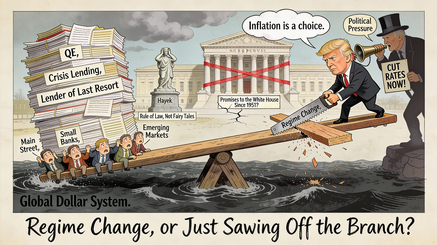 From a classical liberal perspective, this should set off alarm bells. The case for rules-based monetary policy isn’t about shrinking the central bank’s toolkit in the name of ideological purity—it’s about establishing predictable, credible frameworks that allow the central bank to respond systematically to changing economic conditions. Hayek’s concern was that discretionary authorities lacked the knowledge to fine-tune the economy; his solution was competitive currencies and stable monetary frameworks, not hobbling the lender of last resort in the middle of a financial panic.