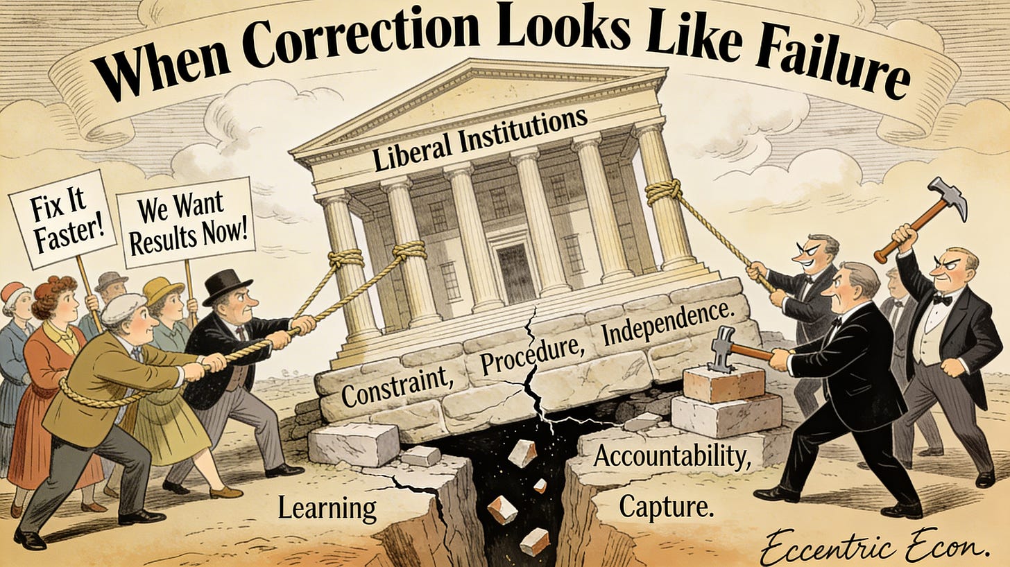 Liberal institutions therefore operate under a persistent tension. To remain democratically legitimate, they must ultimately respond to public concerns. Yet to remain capable of learning, they must sometimes resist immediate demands long enough to evaluate outcomes and incorporate feedback over time. Constraints that slow decision-making — independence, procedure, and limited discretion — are not obstacles to accountability but conditions that make meaningful accountability possible. When this distinction becomes difficult to recognize, restraint begins to resemble betrayal.