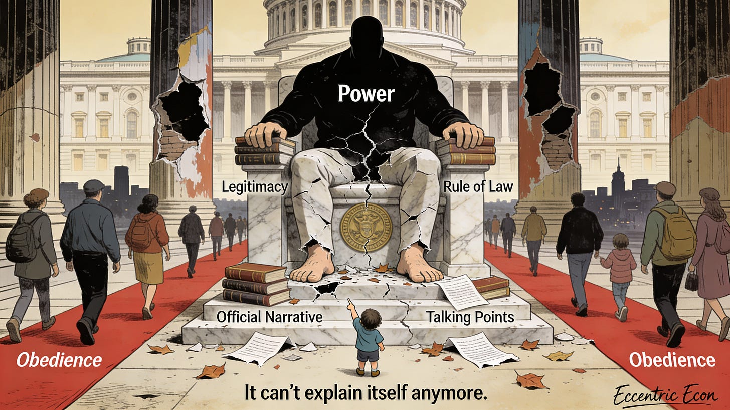 The argument below is meant as a complement to her piece rather than a restatement of it. If Jennifer is giving us the field report from inside a fraying order, this is an attempt at the mechanism design: a sketch of how legitimacy, narrative, and what Timur Kuran famously called “preference falsification” interact to let systems look stable right up until the day they don’t. Her line—“Power does not collapse when challenged. It collapses when it can no longer be explained.”—is the thesis; what follows is one way of cashing out why that’s true for modern democracies, liberal hegemons, and any regime that depends more on authority than on raw coercion.