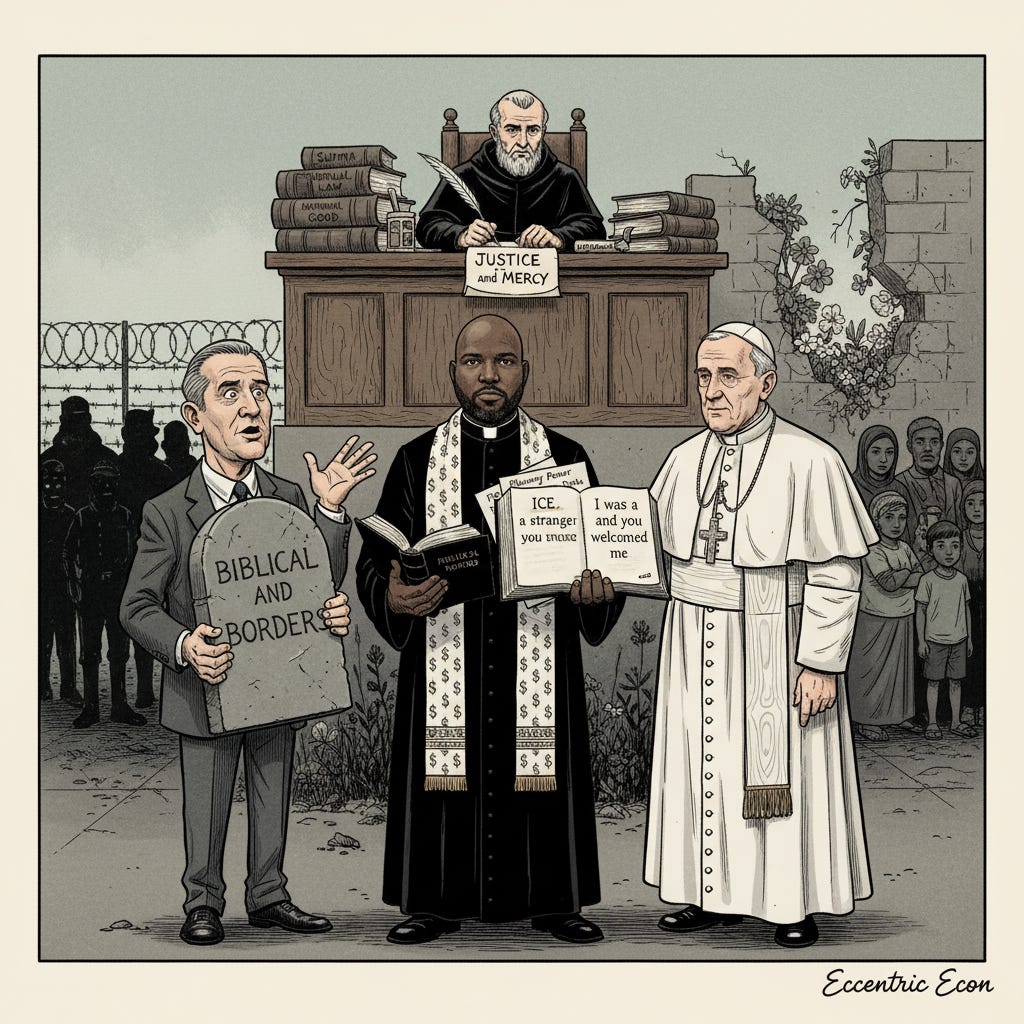 The House speaker of the United States has decided to explain the Bible to the bishop of Rome, and we are all expected to nod along as if this is a normal development in Christian theology rather than a live‑action Babylon Bee sketch. The good news is that Pope Leo XIV is right (oh, how it BURNS for me to admit this), Mike Johnson is wrong, and the actual Christian problem in American immigration policy is not a lack of walls, but a surplus of impunity—legal, bureaucratic, and theological.